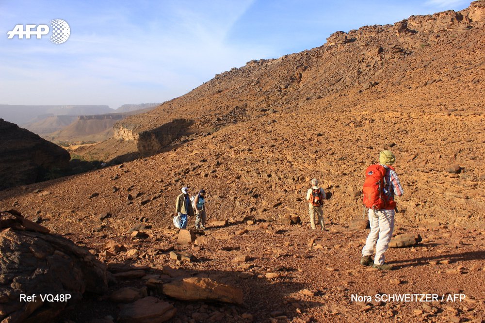 Des randonneurs et leurs guides près du village de Tergit, au sud d’Atar, en Mauritanie, le 27 décembre 2017. CRÉDITS : NORA SCHWEITZER / AFP En savoir plus sur http://www.lemonde.fr/afrique/article/2018/01/12/dans-le-sahara-mauritanien-les-touristes-reviennent-et-l-espoir-aussi_5241007_3212.html#DVHw6PqTu4OQdmUh.99