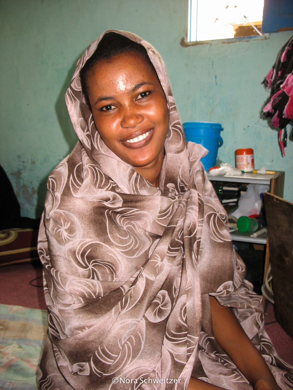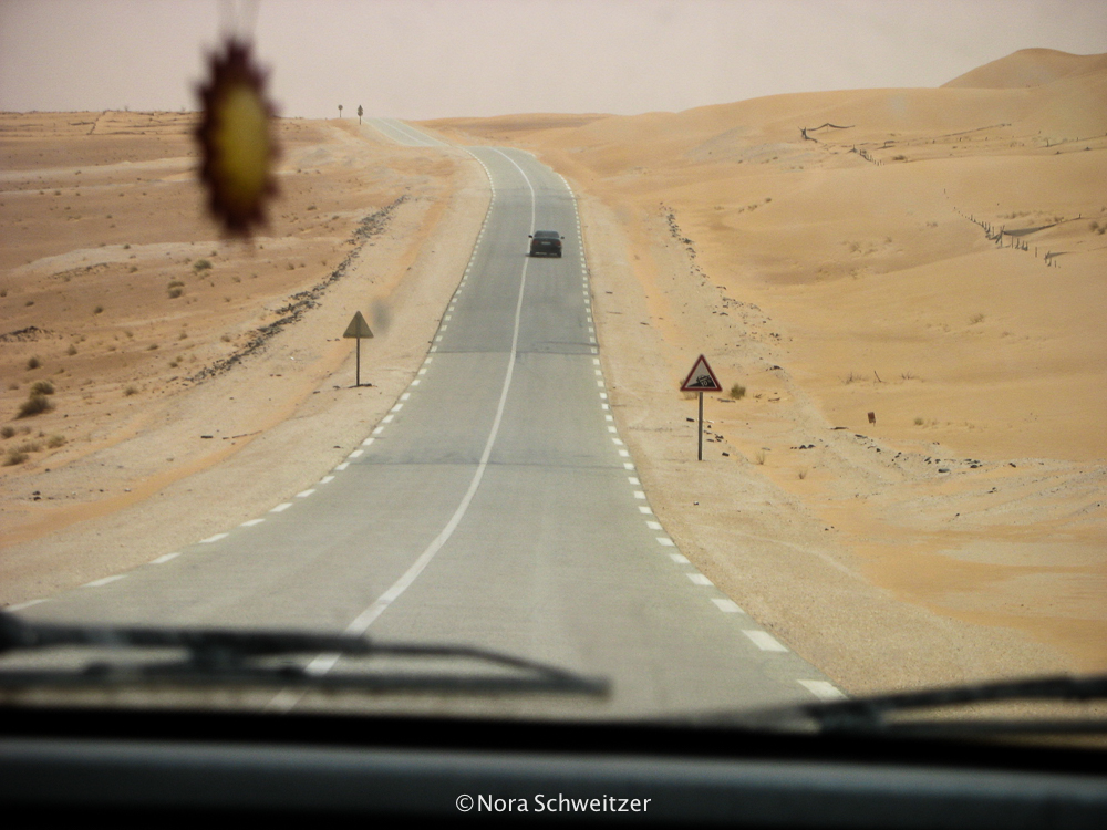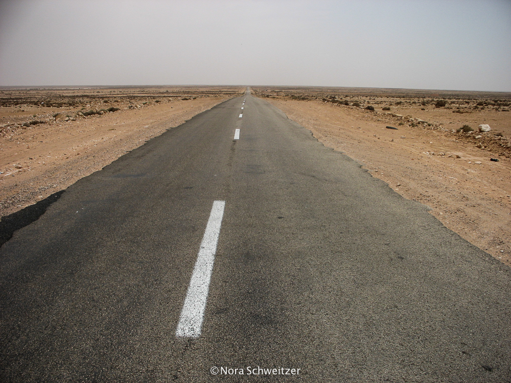 Trois semaines s’écoulent à Nouadhibou avant que je ne décide de reprendre la route. Un pouce levé et me revoilà auto-stoppeuse, direction Nouakchott ! Lorsque le 4×4 de mes gentils pilotes passe les portes de Nouadhibou et trace à toute allure à travers les 500 kilomètres de désert absolu qui nous séparent de la capitale, je réalise que j’étais bel et bien au bout du monde ! Sept heures de route sur une fine bande de goudron brut posé en plein milieu des sables… Une chaleur terrifiante. Un contraste goudron noir/sable jaune ininterrompu jusqu’à Nouakchott.